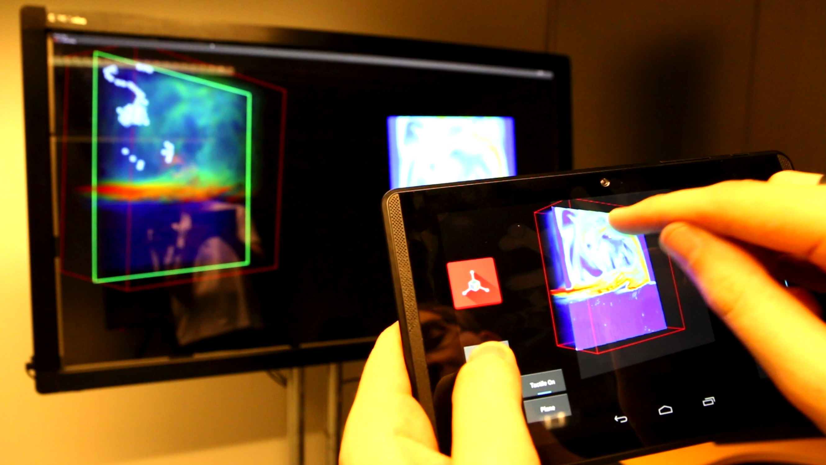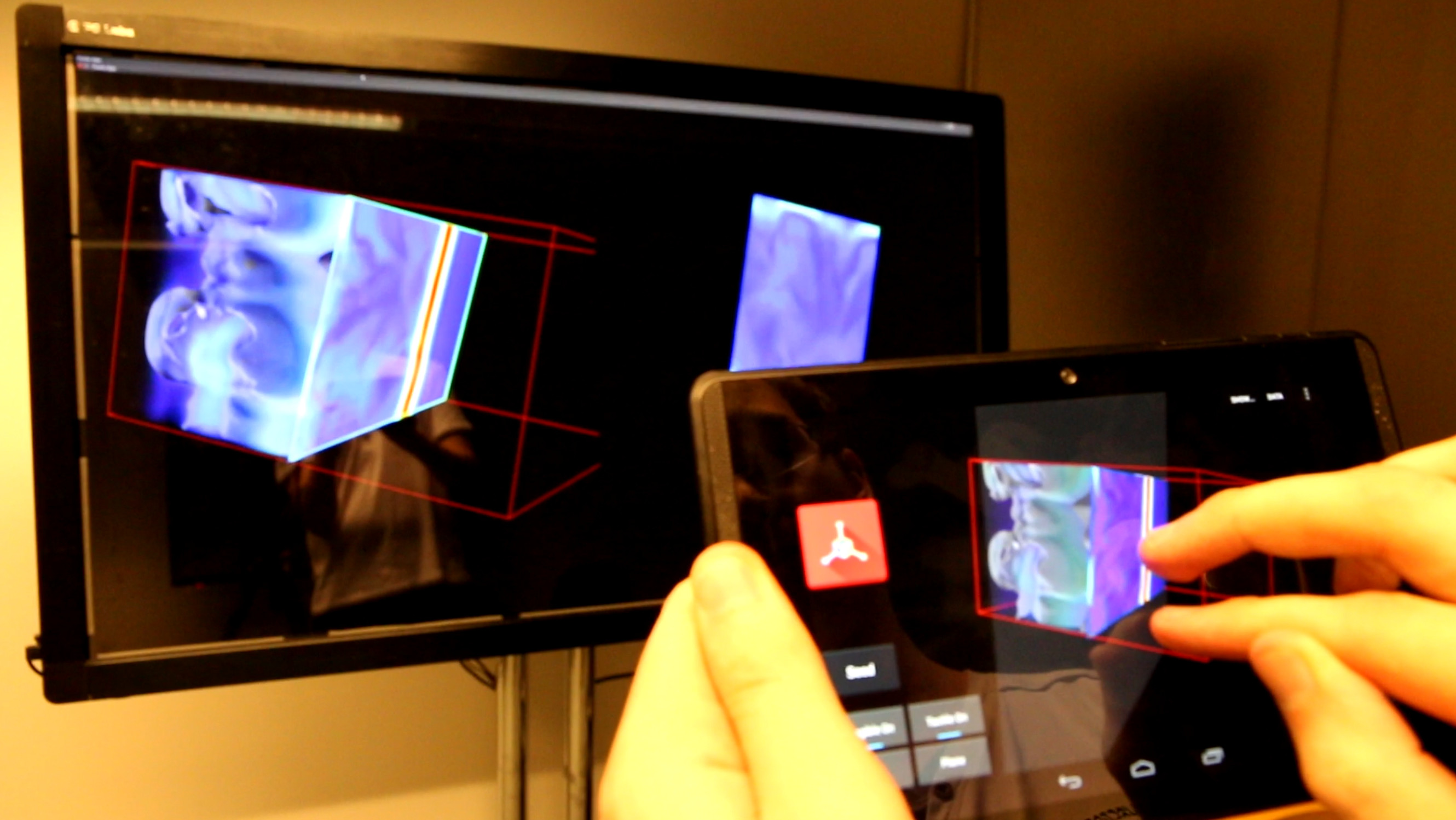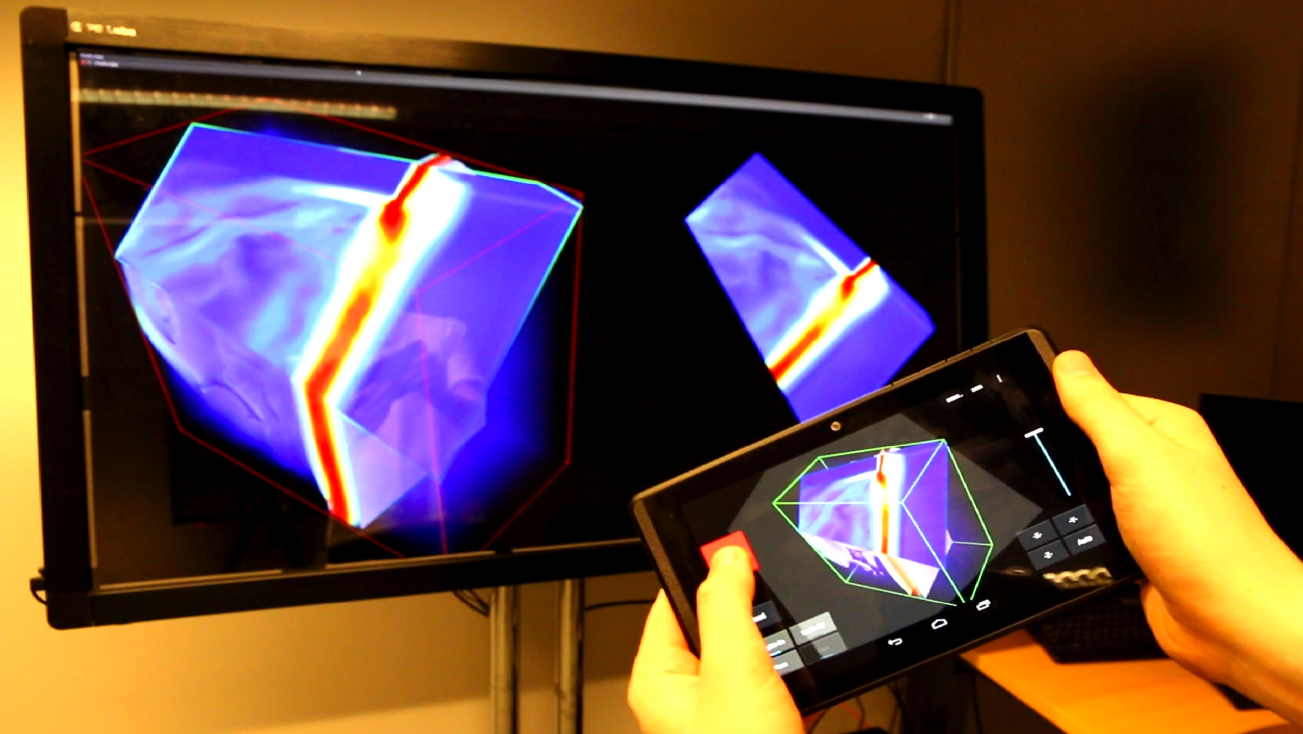 We have implemented the code with two different parts. The code running on a seperate Unix Machine for rendering-only options and the code handling all the interaction on the tablet side. You can get the code on Github with the following links: Here for the Unix code. Here for the tablet code. (To run, needs a Google Tango Tablet).